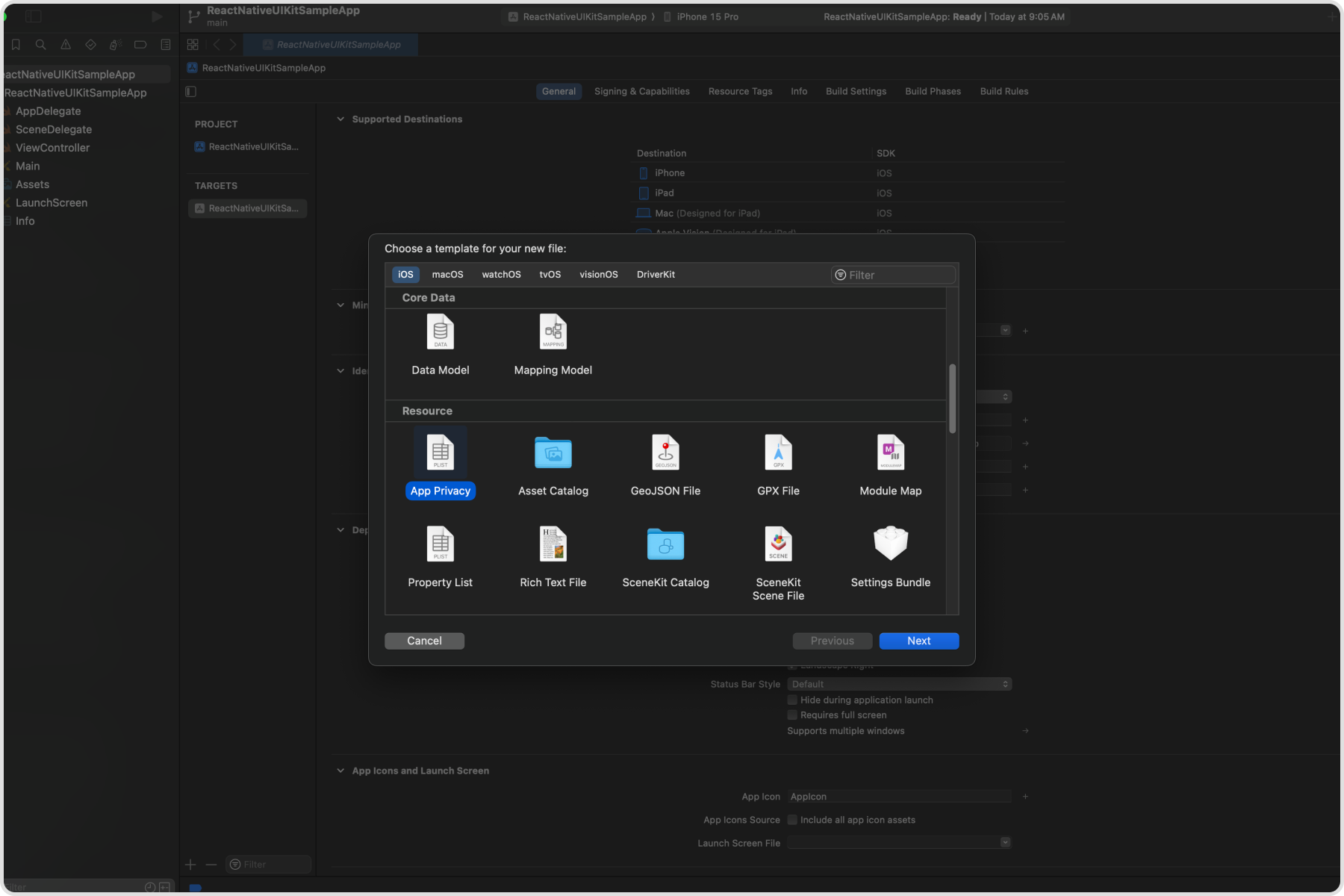 Scroll down to the Resource section. Select the App Privacy file type, click