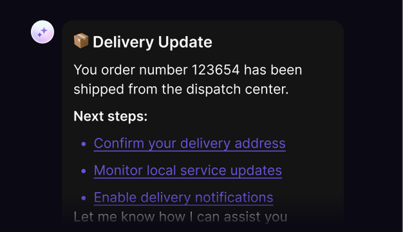 Copilots to guide users through onboarding, listings, dispute steps, and order checks. Pull real-time backend data and shift the user to the right screen or form whenever the workflow calls for it.