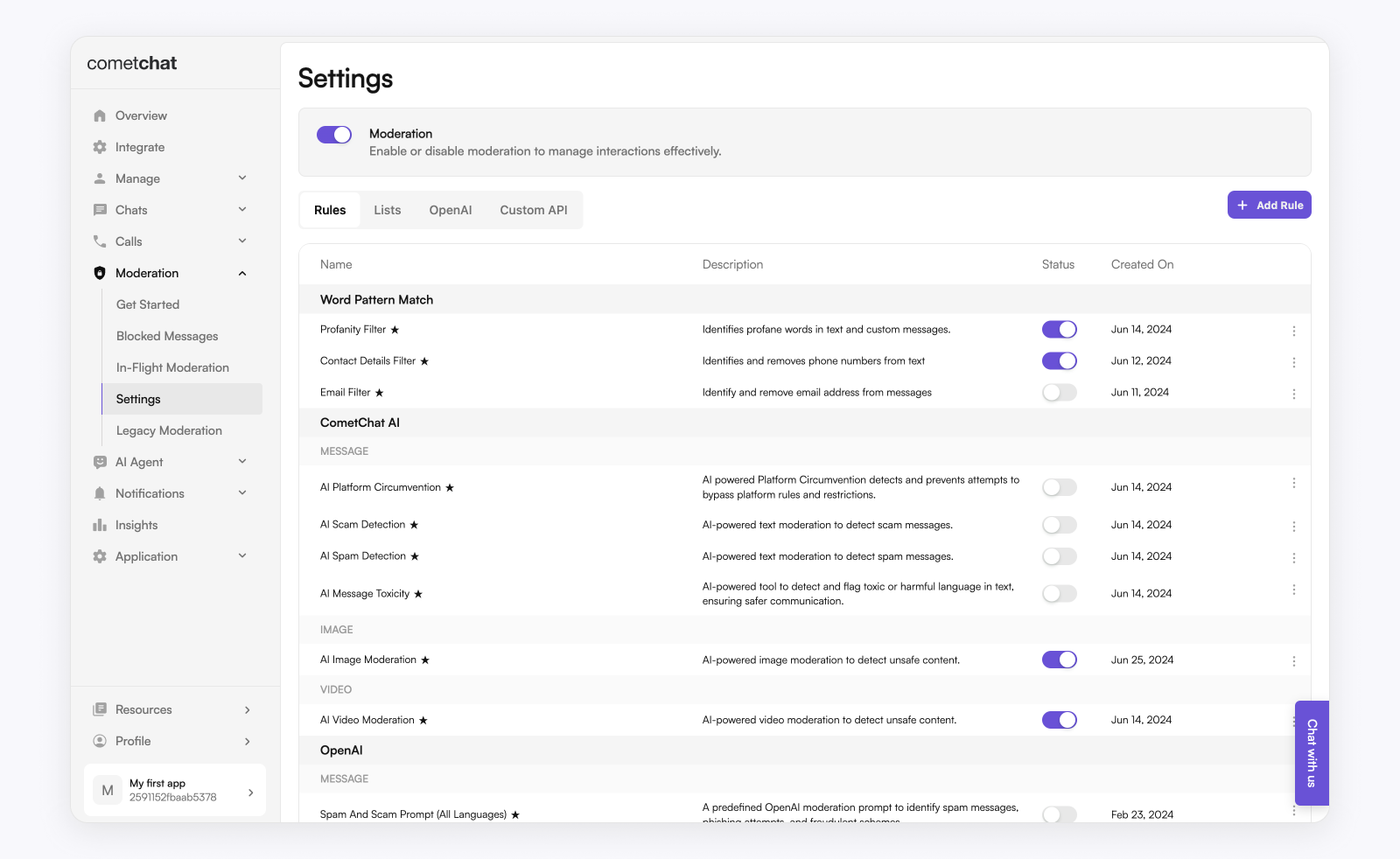 Start with robust, built-in protection. Preset filters catch profanity, hate speech, spam, and more - using pattern matching plus native AI. You can enable, tweak, or expand rules directly from your CometChat dashboard.