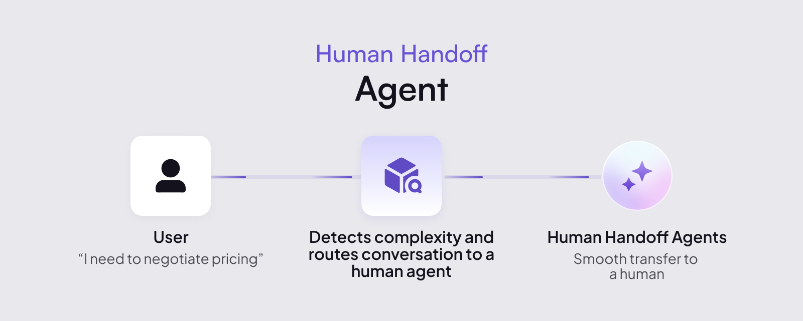 Sometimes humans are irreplaceable. The Human Handoff agent detects when that’s the case and smoothly transfers the conversation to appropriate human agents then hands it back once resolved. It doesn't just dump the conversation—it provides context, maintains conversation history, and can smoothly transition back to AI assistance when appropriate.