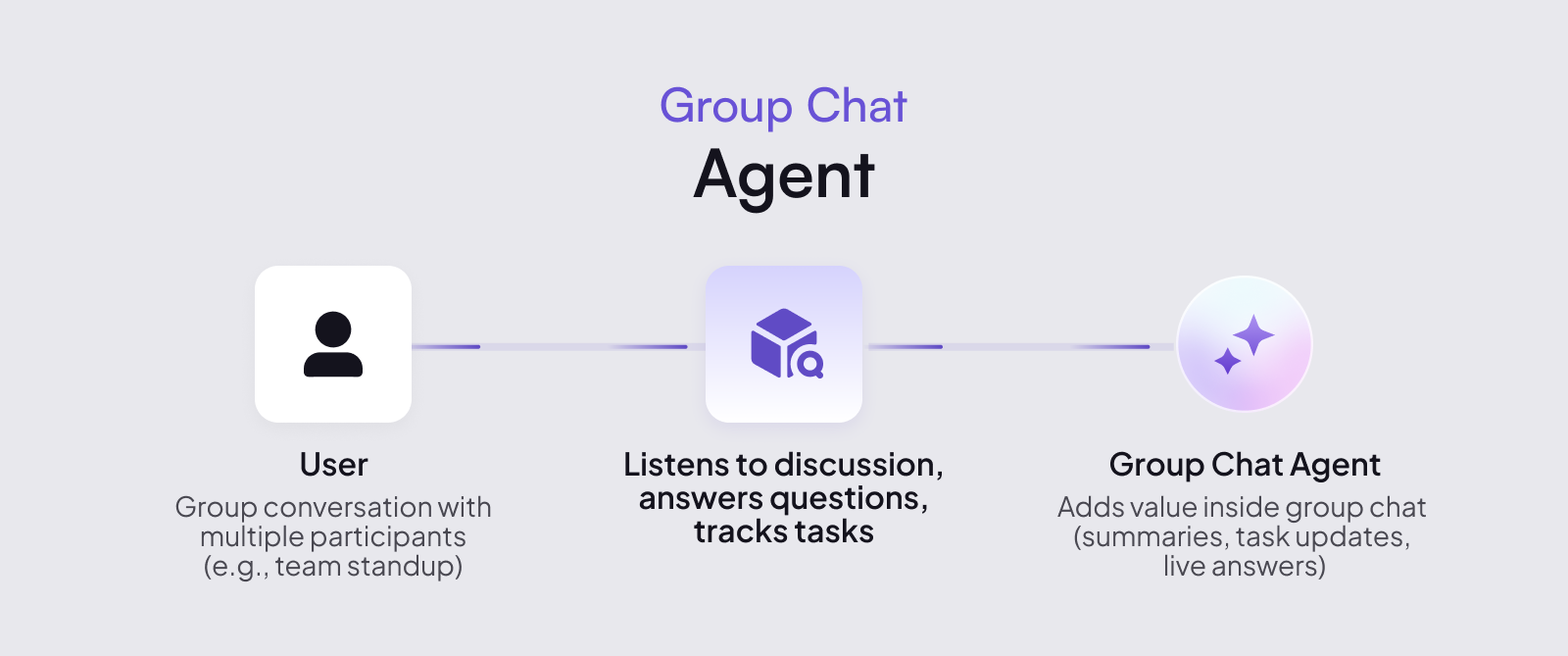The Group Chat Agent participates in multi-user conversations, understanding context from multiple participants and providing relevant assistance to the group as a whole. It can distinguish between different users, maintain conversation context, and provide value that benefits the entire group dynamic.