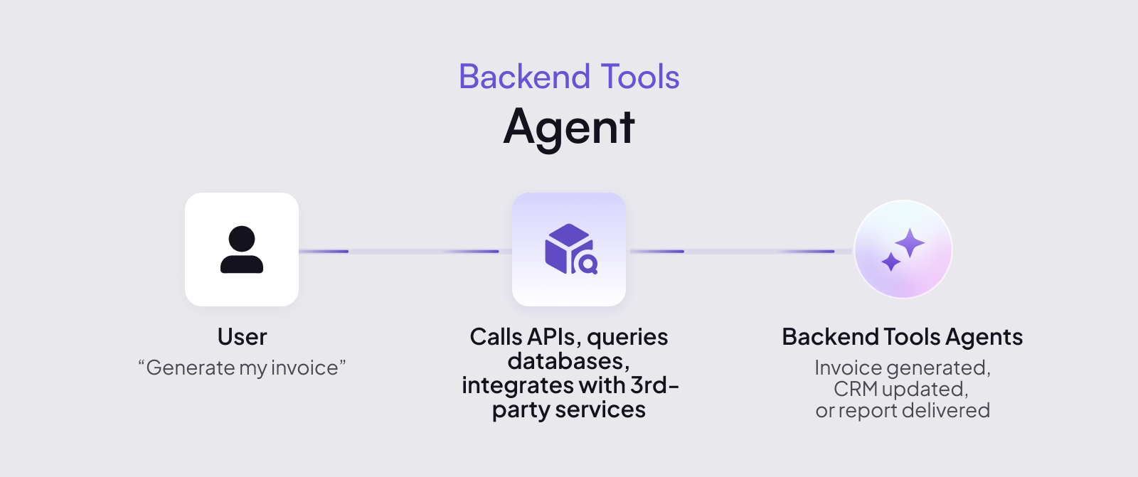 The Backend Tools Agent operates behind the scenes as your digital workforce, performing server-side operations by calling APIs, interacting with databases, triggering automated jobs, and communicating with third-party systems. It's the bridge between user requests and your backend infrastructure.