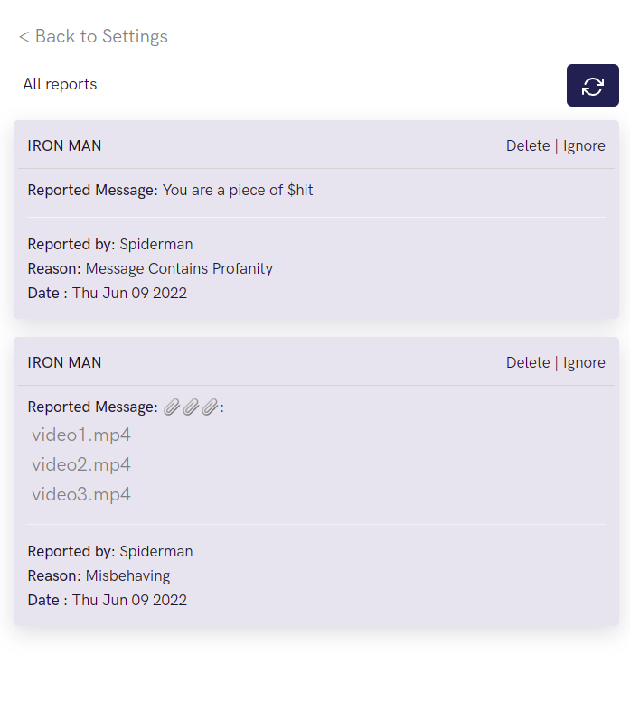 - Moderation actions: Get the list of reports on the configured Webhook URL.