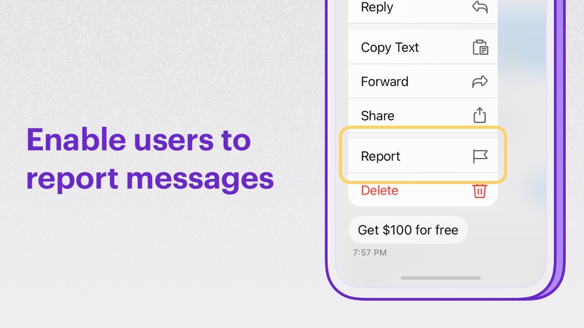Messages can be reported in either group conversations or one-on-one conversations. In the context menu of a message, you can have a “Report” button. Clicking it should open up a modal asking for the reason. Here’s the description of the parameters that need to be passed to the extension:Parameters | Value | Description |