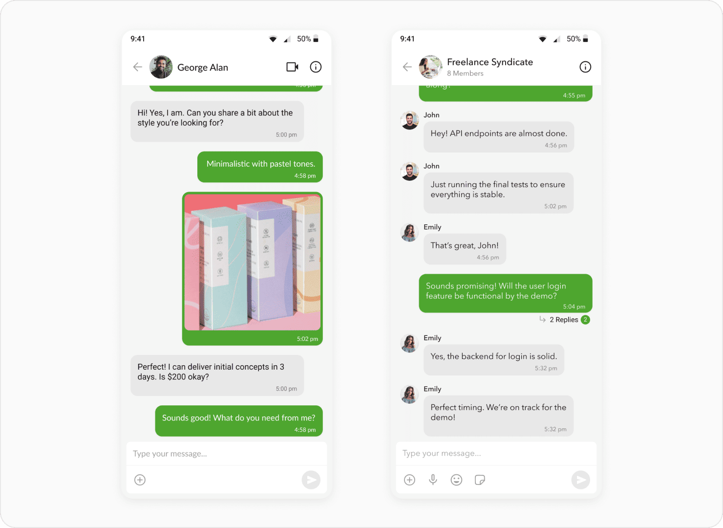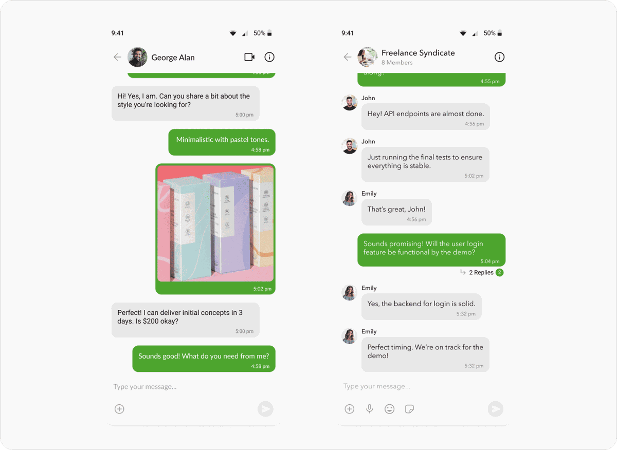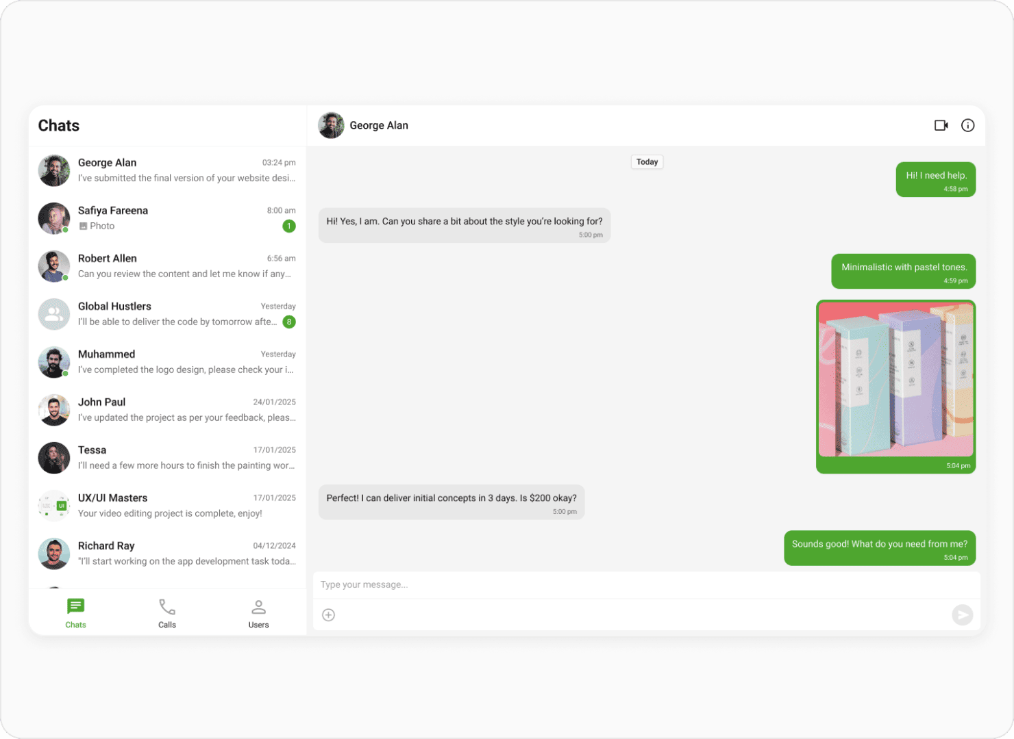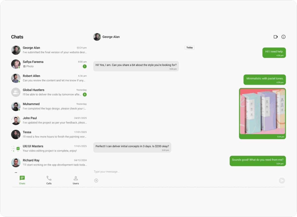 For freelance job platforms, this template allows structured messaging between clients and freelancers. Enable seamless collaboration, project discussions, and contract-based interactions in a professional chat environment.