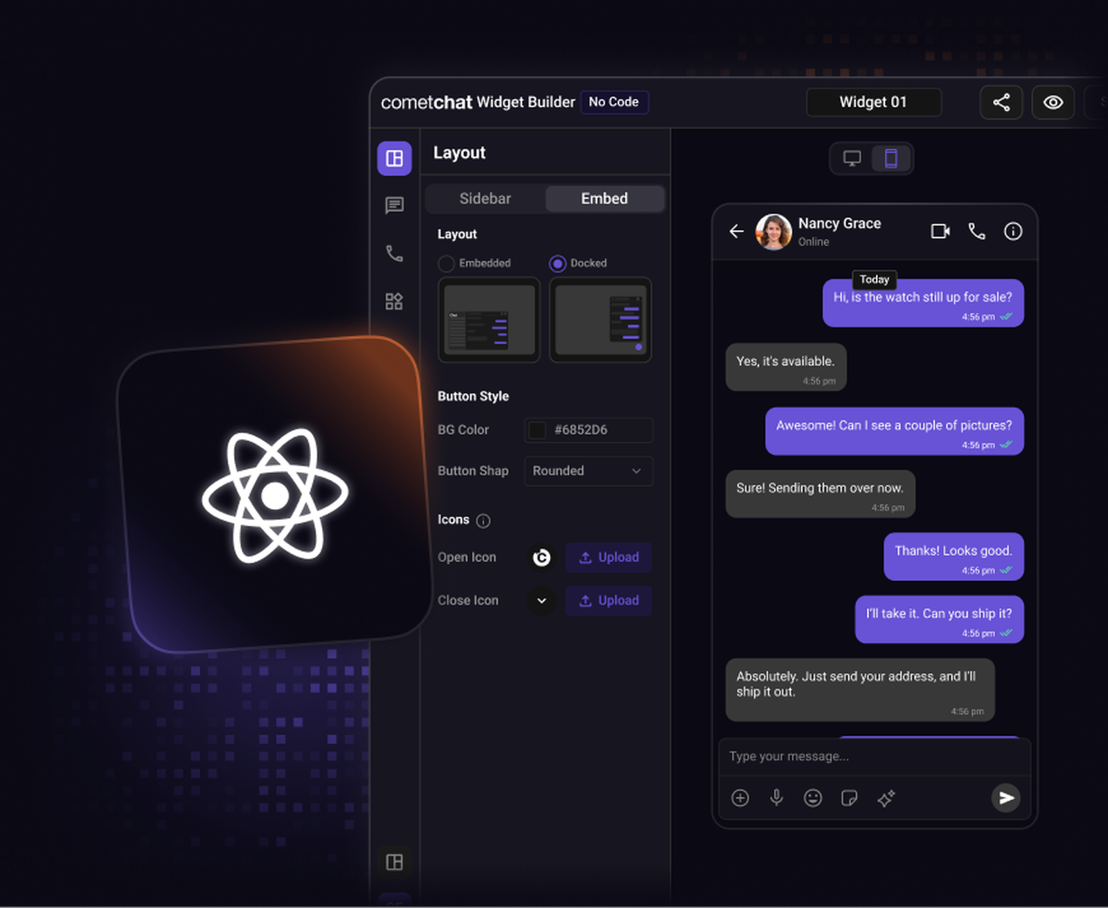 Instead of building your UI piece by piece, you’ll use CometChat’s UI Kit Builder to visually configure your chat interface and export production-ready React code.