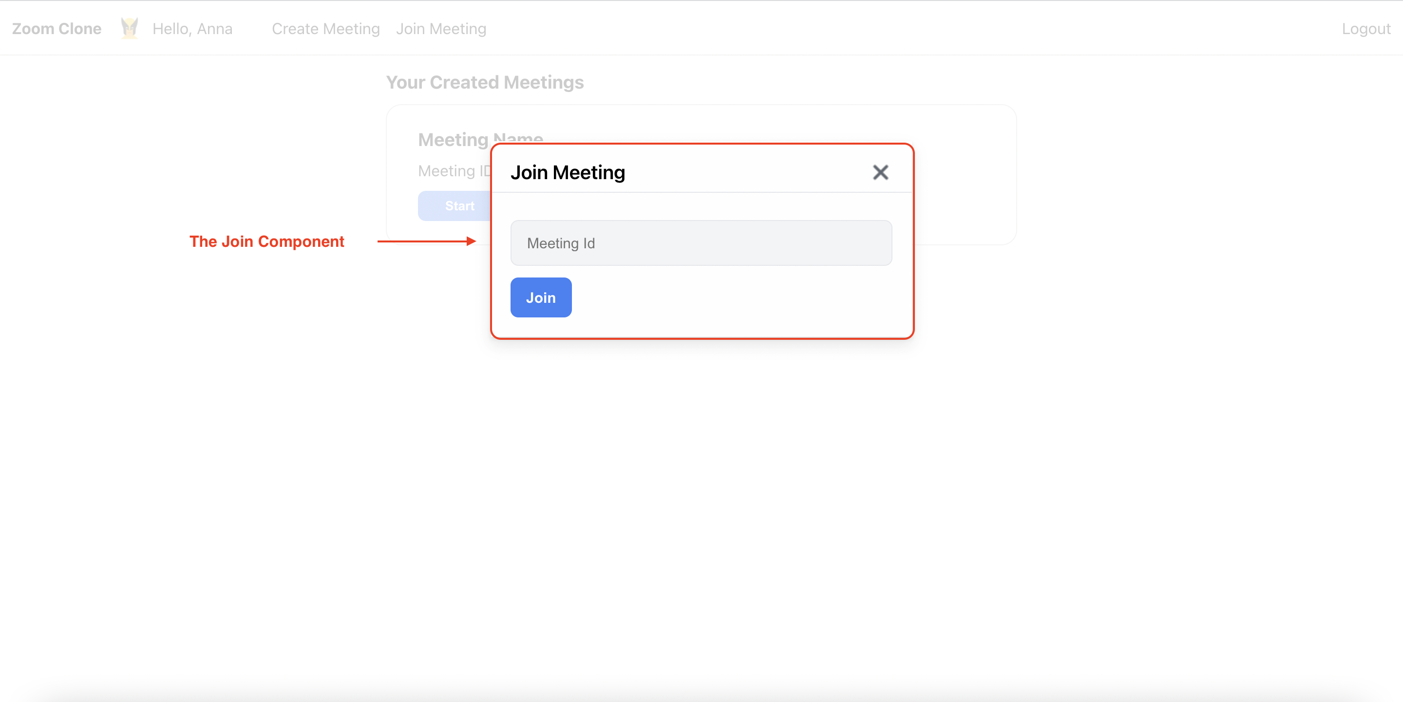 After create a new meeting, we can get the meeting id and share to other users. Other users can use that uid to access the created meeting. As you can see in the image above, the users just need to input the meeting uid and then click on the “Join” button. Please create the “Join.js” file inside the “home” folder. The full source code of the Join component can be found here.