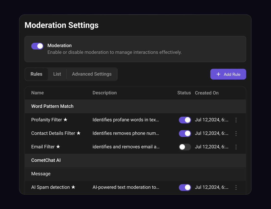 CometChat offers built-in moderation with an enhanced rule engine and contextual moderation, fully configurable from the dashboard. Manage rules, prompts, thresholds, and fallback logic from a single UI.
