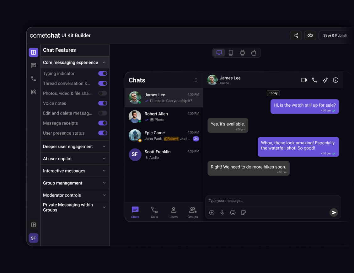 CometChat's comprehensive UI Kits are equipped with all in-app chat features that make for a stellar user experience, including quoted replies, conversational search, rich media support and more.