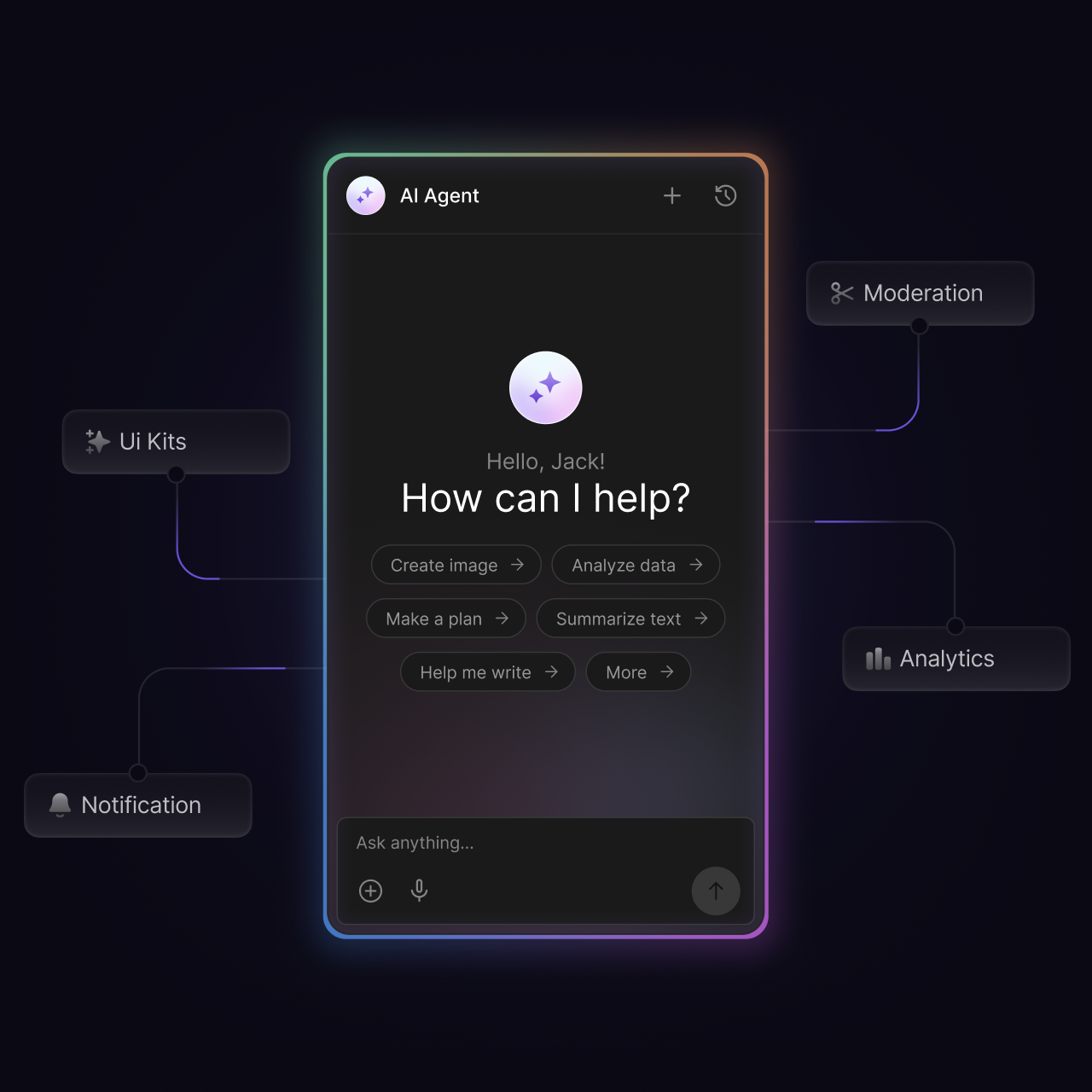 Open source SDKs and APIs for all popular frameworks to build bespoke chat experiences, compatible with any UI Kit.